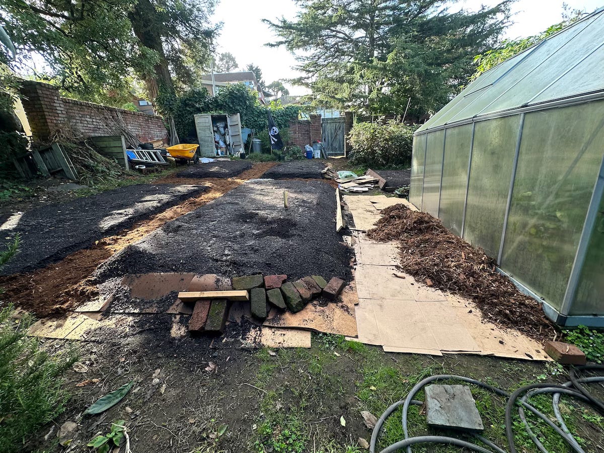 We had hundreds of brand new cardboard boxes left, so those came and became the first layer of mulch. The theory is that the cardboard decomposes, over several months - and that - when covered with 3 plus inches of soil, compost, or mulch - will kill off the vast majority of weeds under it. Additional material has to be added every year - but - if I understand correctly - the cardboard is a one time thing.