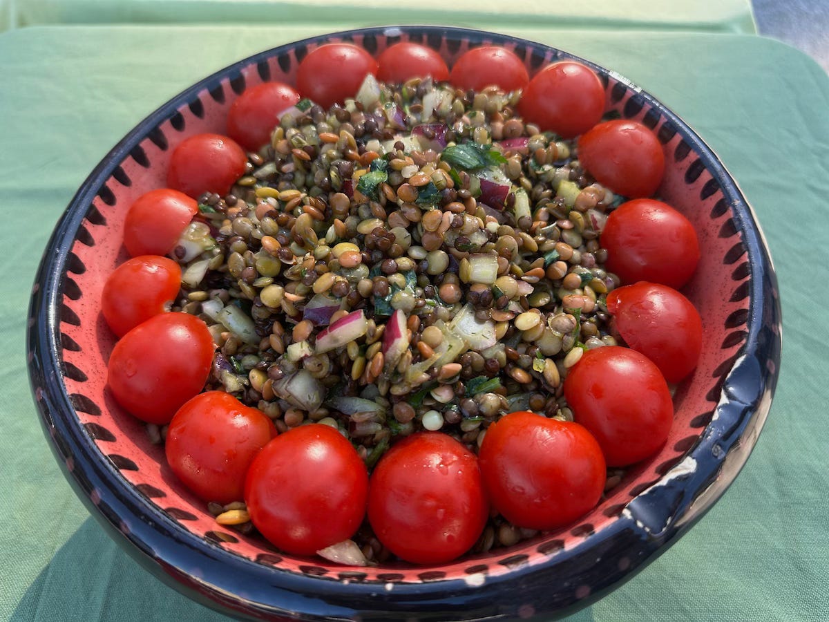 Sprout your choice of Lentils to whatever size you prefer (we like them short - at about 36-48 hours, post-Soak). Dice onion (Lori does a large dice) and chop parsley leaves to desired size. Mix the curry and dill into the oil and vinegar - and then blend all together. As you see in the picture (atop this Newsletter), she used the cherry tomatoes as a ring - but you can mix them in too. It’s your food - so do your thing.