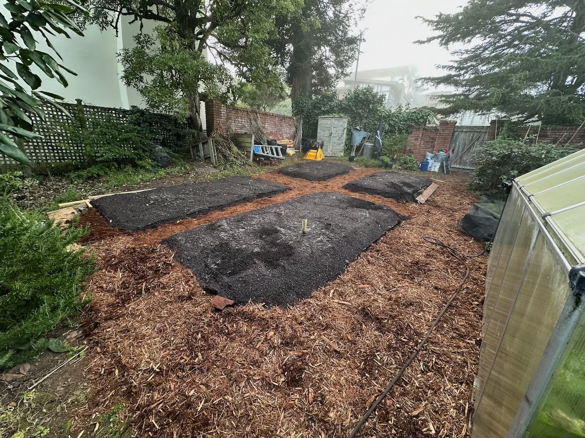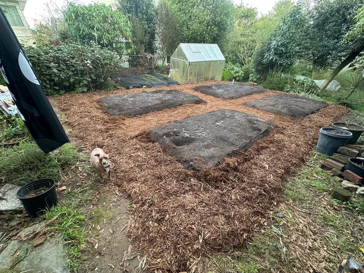 Before sharing pictures of our 4 legged family and friends - I’m going to share a glimpse into how deranged I am. Once we were done with our warehouse, and had our garage vaguely organized (it looks like a miniature version of our warehouse), I spent every minute I could, preparing our garden for my fall garlic planting - and for next year. My friend, Jason - who built our greenhouse (with my assistance) in 2020, had steered me to a You Tube gardener with a no-dig method. I’m not opposed to digging, but our soil is horrid - despite ten years of my efforts to improve it. Our part of San Francisco has really sad soil. It’s basically water repellent sand, and it’s cool and foggy through the summer - so it’s not an easy place to grow much, but like the farmers we so admire - perseverance is something I have in abundance, so I went nuts!